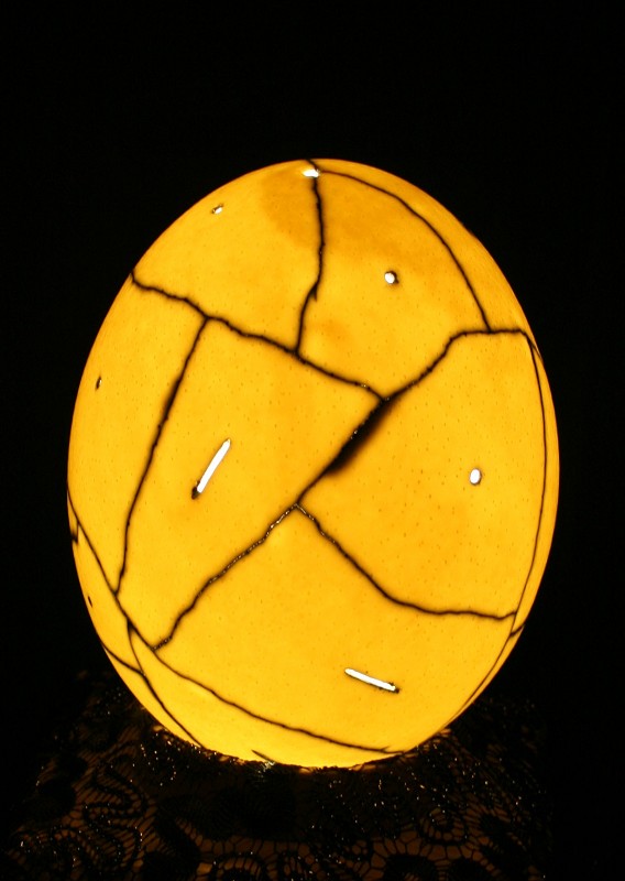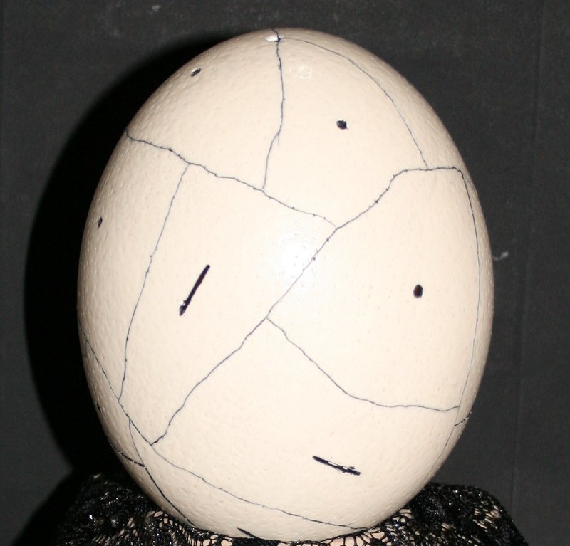 Material: Schalenstücke vom Straußenei, Tusche, Holzfuß